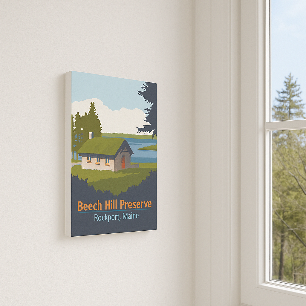 Celebrate one of Midcoast Maine’s most beloved hidden gems with this richly colored canvas print of Beech Hill Preserve. Featuring the iconic sod-roofed stone hut overlooking Penobscot Bay, this design captures the quiet charm of Rockport’s coastal farmlands and forests. Whether you’ve hiked up for the view or just love Maine’s pastoral landscapes, this piece brings a sense of peace and place to any room.